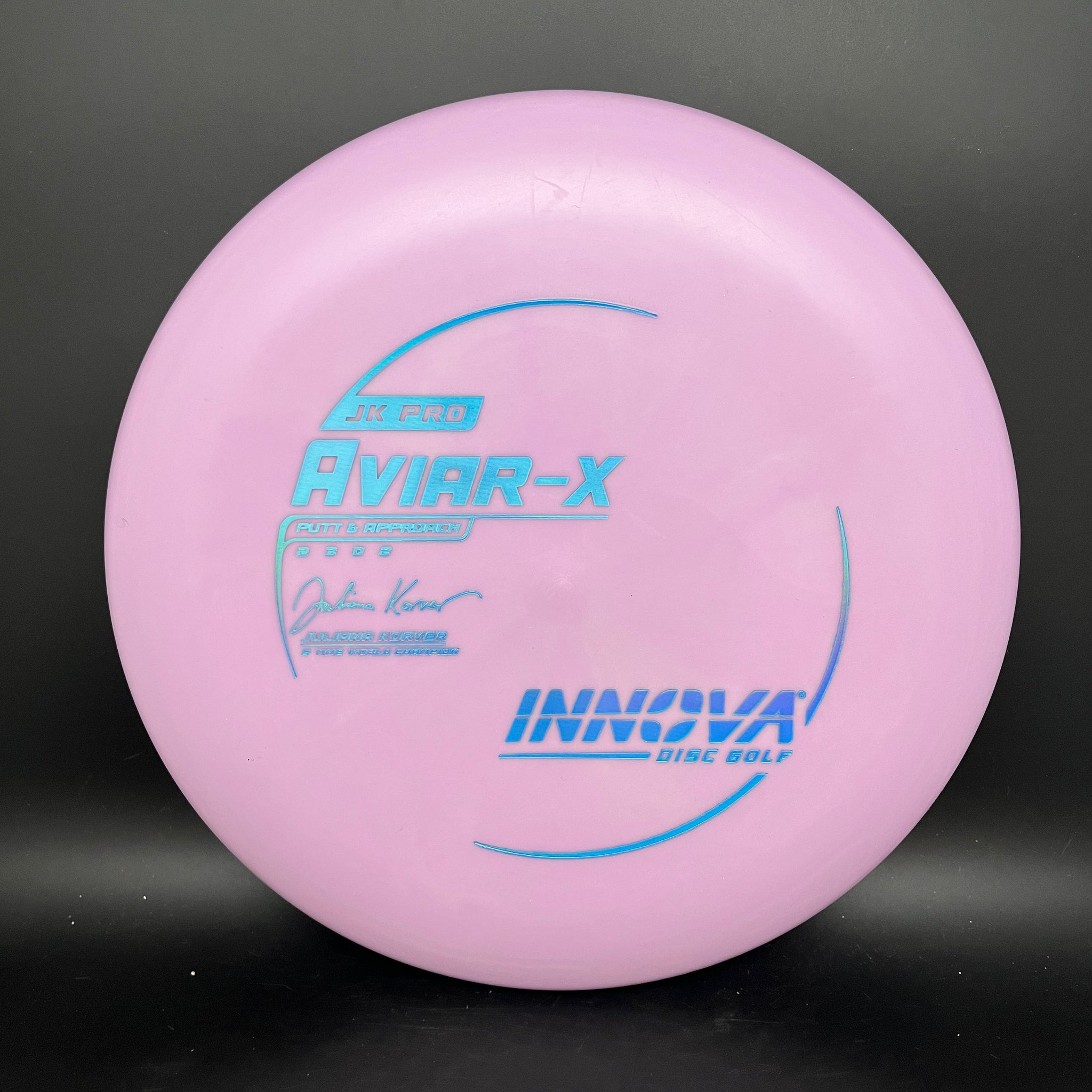 The JK (Juliana Korver) Aviar is made from the driver mold in a special blend of durable Pro-line Plastic that is more flexible and grippier than the other Aviar models. It has the same flight characteristics as the KC Aviar. Its softer plastic is better in colder climates and for those who have dry hands and require a tackier grip.
